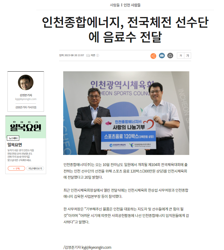(경인일보)인천종합에너지, 전국체전 선수단에 음료수 전달