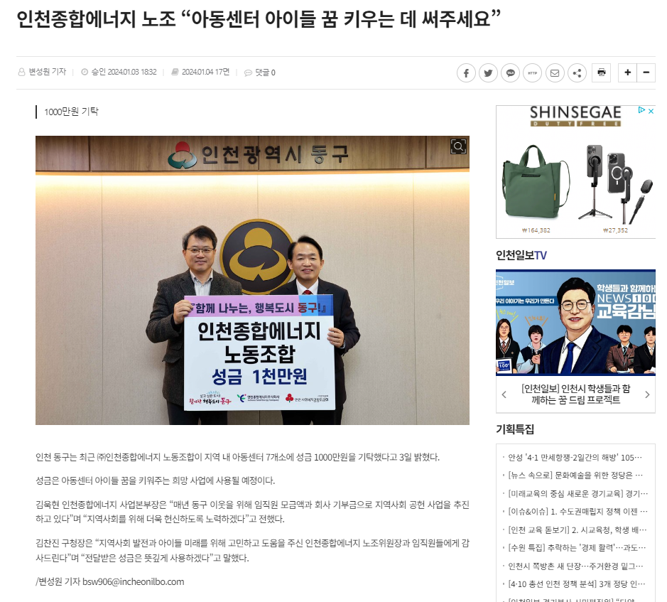 (인천일보)인천종합에너지 노조 “아동센터 아이들 꿈 키우는 데 써주세요”