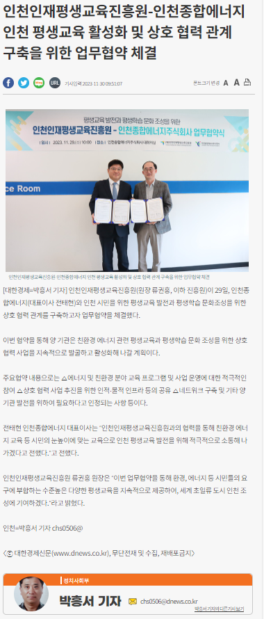 (대한경제)인천인재평생교육진흥원-인천종합에너지 인천 평생교육 활성화 및 상호 협력 관계 구축을 위한 업무협약 체결