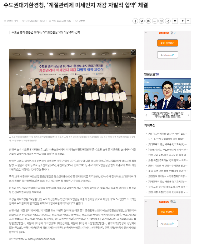 (인천일보)수도권대기환경청, ‘계절관리제 미세먼지 저감 자발적 협약’ 체결